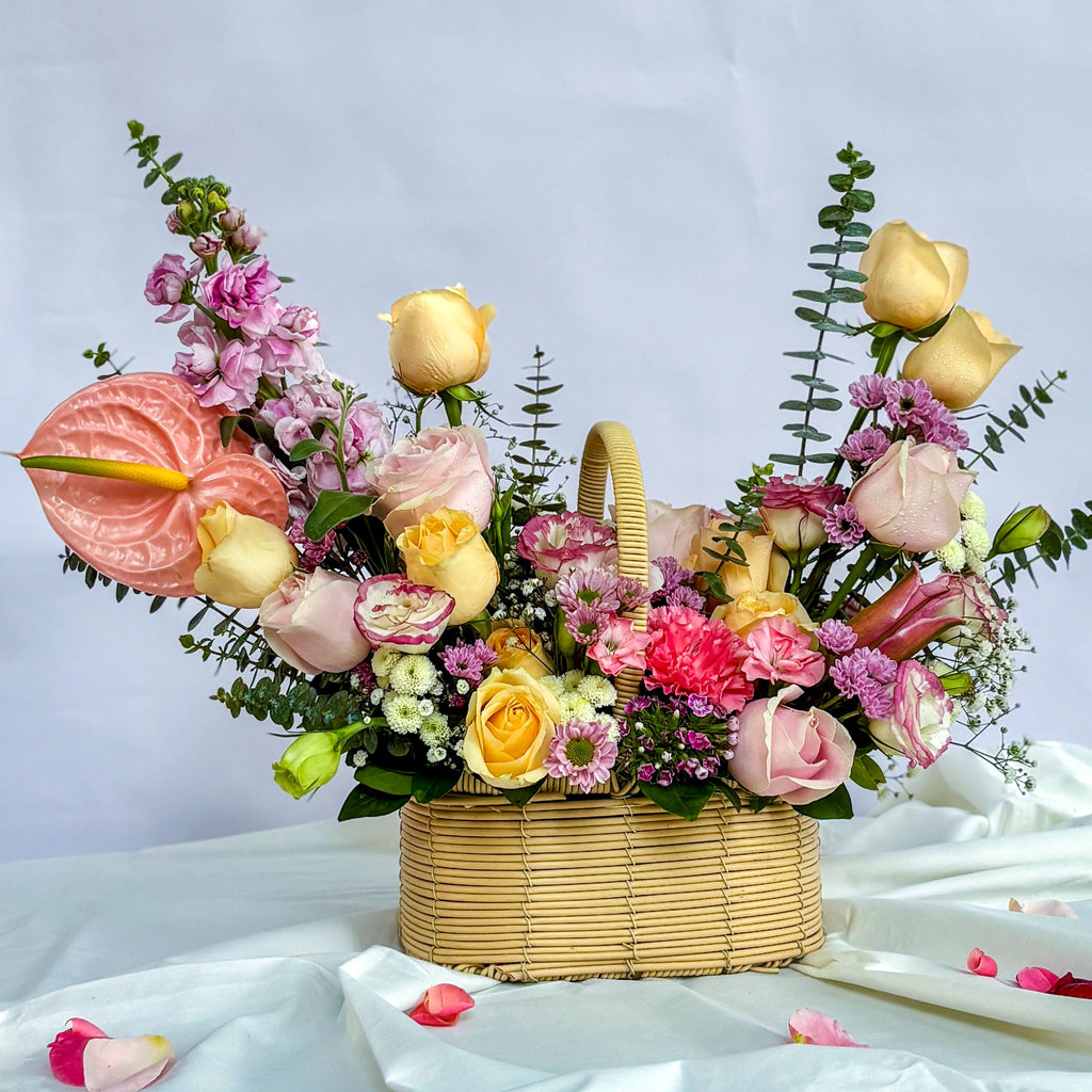 We've gathered the prettiest pastel blooms, think blushing pinks, calming lavenders, and creamy whites and arranged them in a lovely basket that's ready to steal hearts.