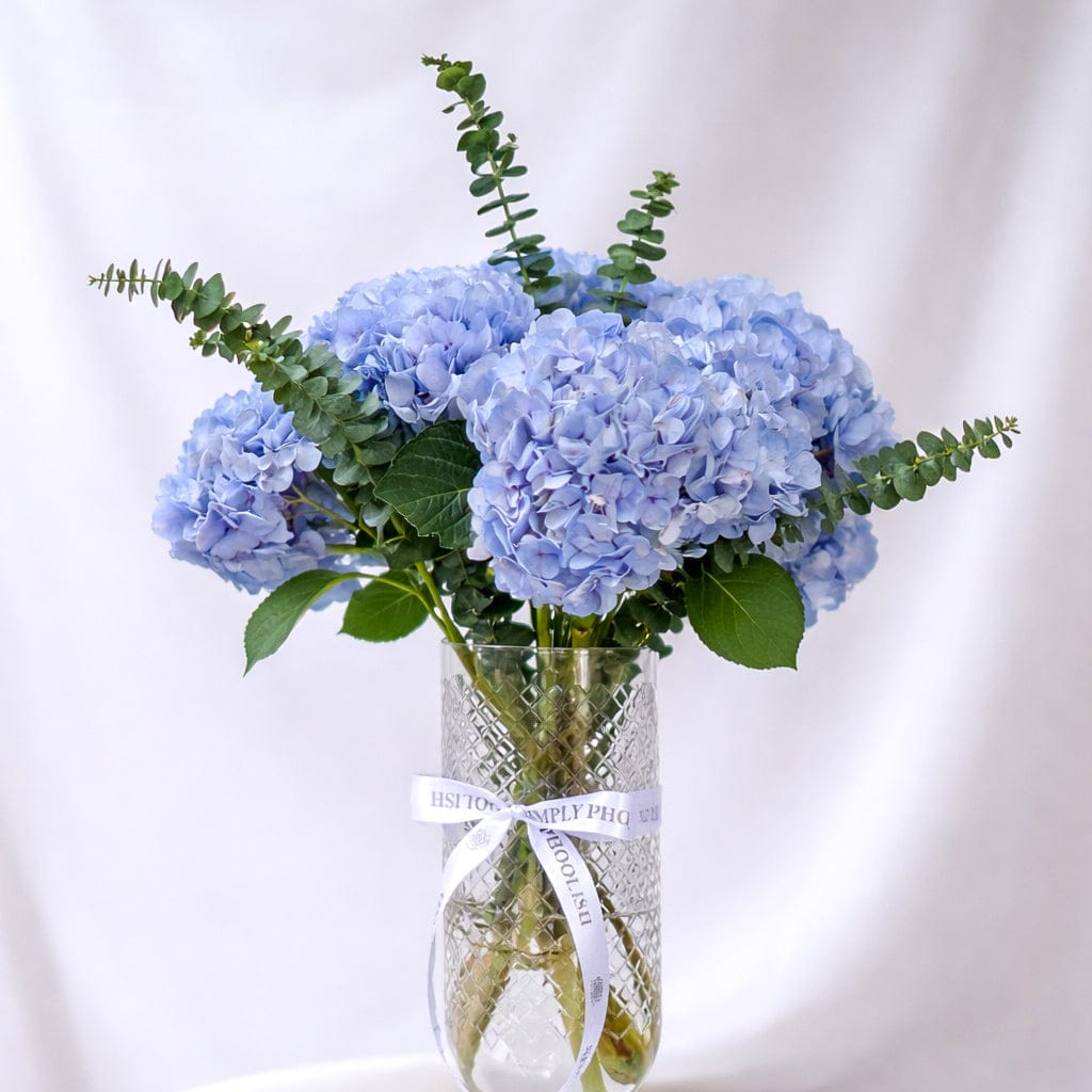 This stunning arrangement captures the rare beauty of a blue moon in full bloom. Lush blue hydrangeas arranged in an elegant glass vase, creating a centerpiece that's both calming and captivating.