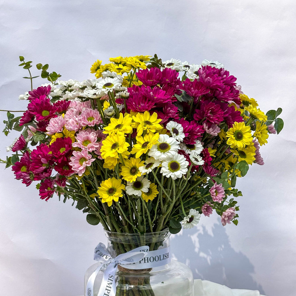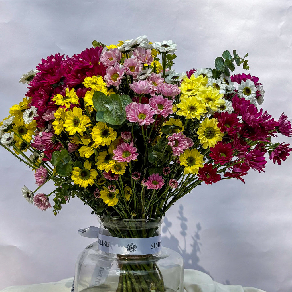 A glass jar brimming with Santini daisies, bright, playful, and impossible to ignore. These petite blooms bring instant cheer, the floral equivalent of opening your windows and letting the light in.