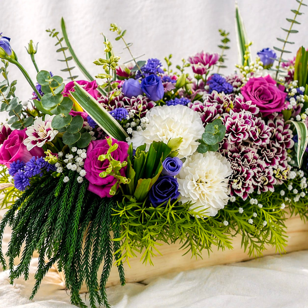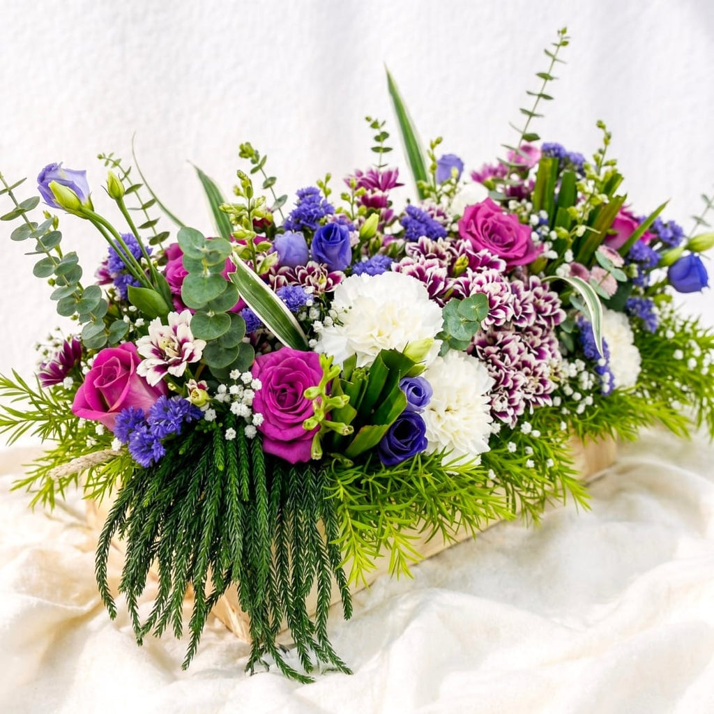 Flowers used: Carnation, Rose, Gypsophila, Blue Daisy, Golden Rod, Silver Dollar Eucalyptus, Eustoma, Santini Daisy