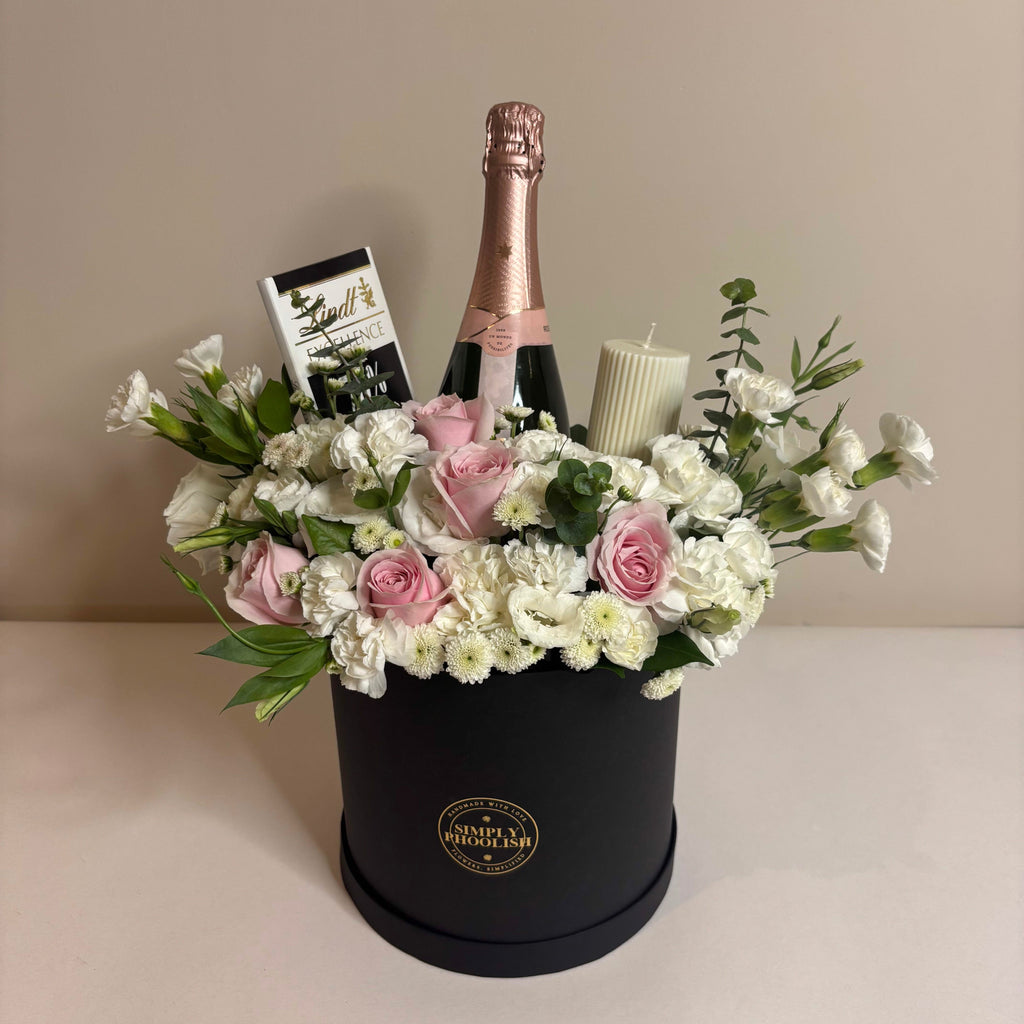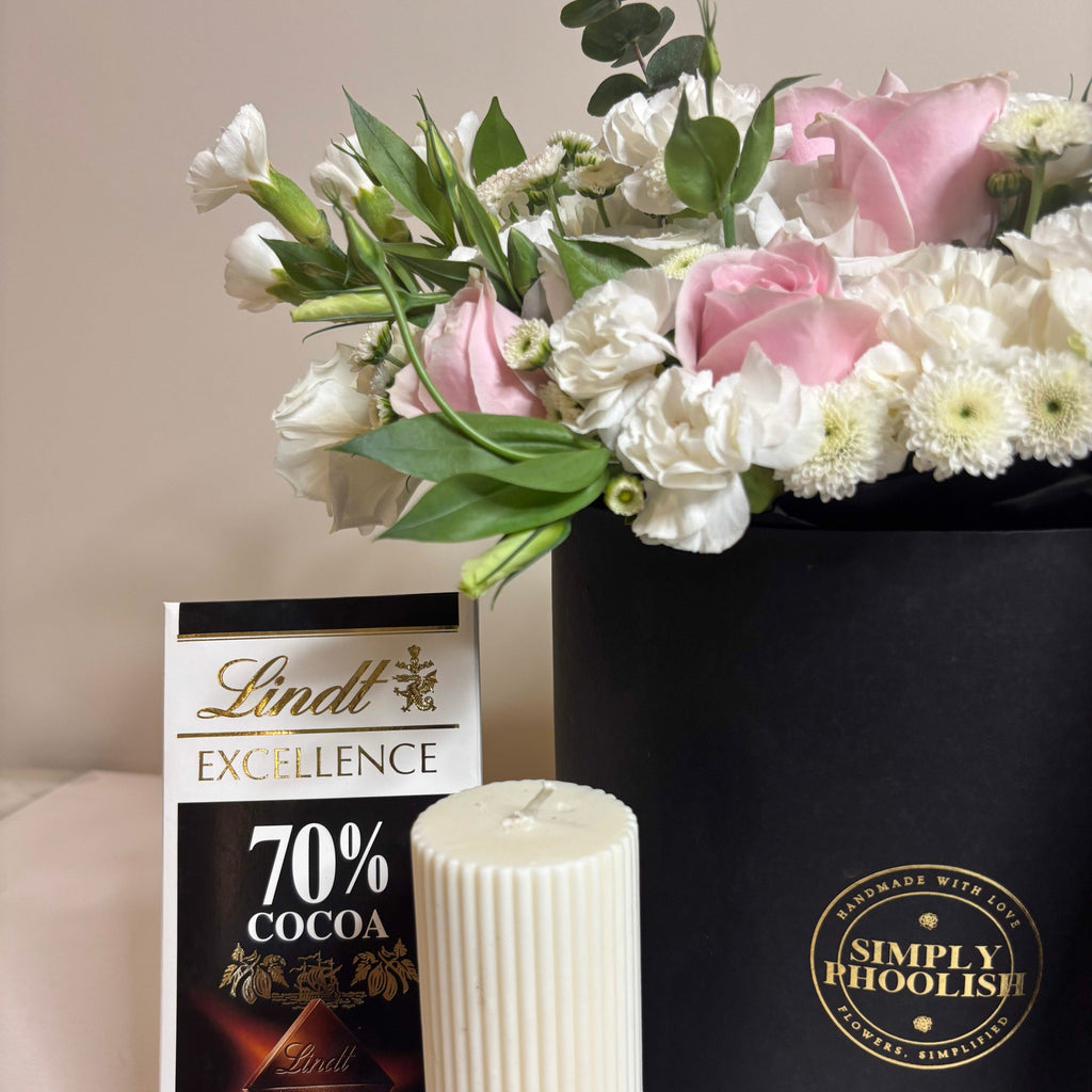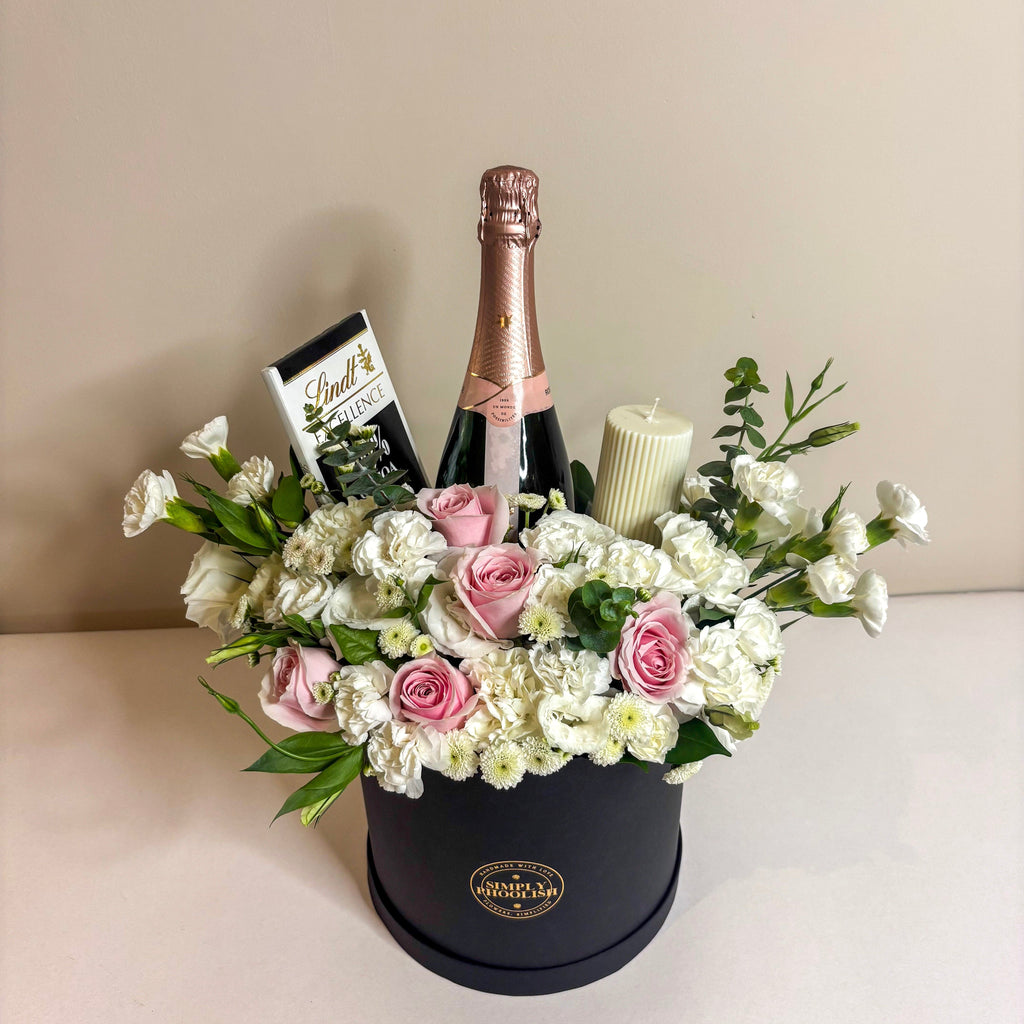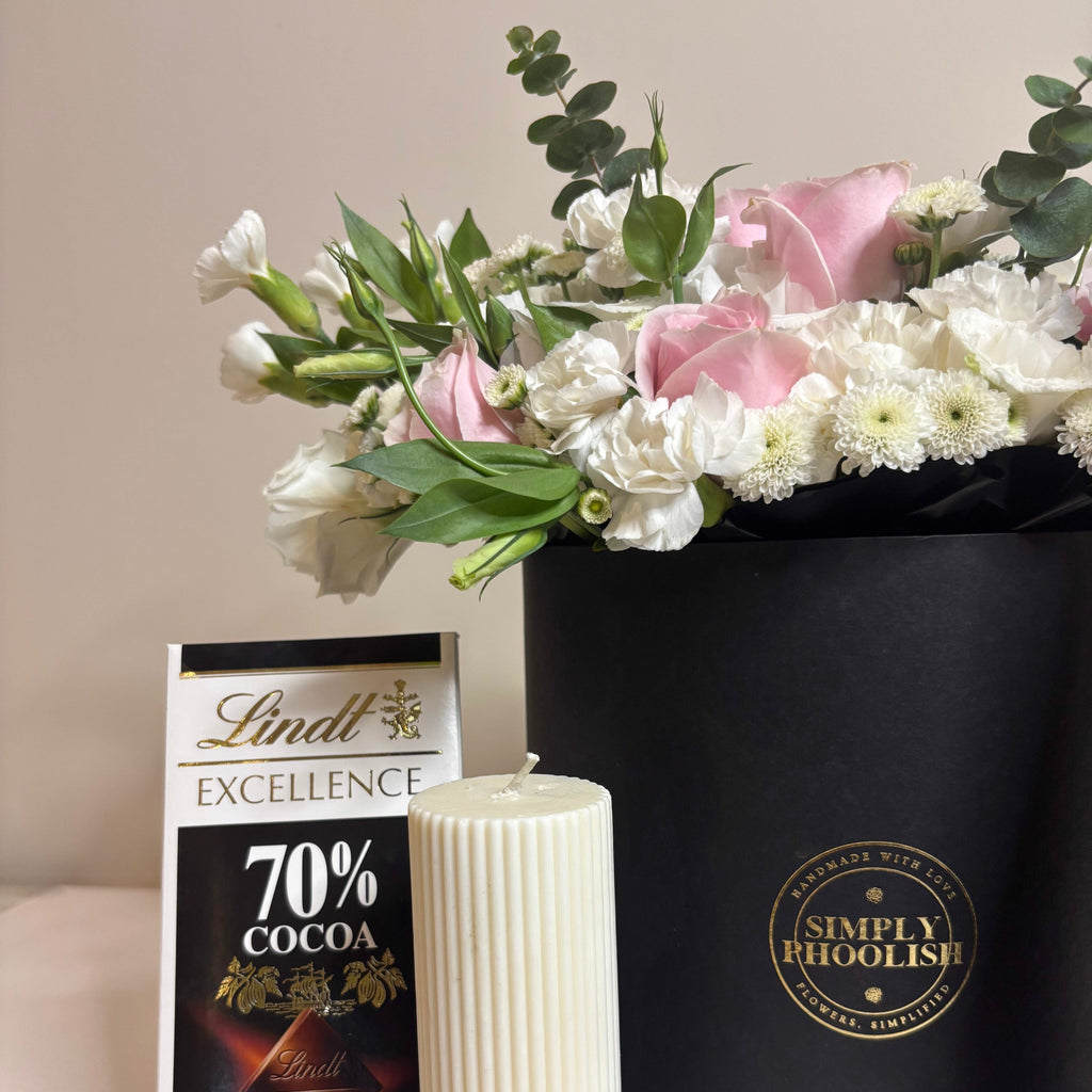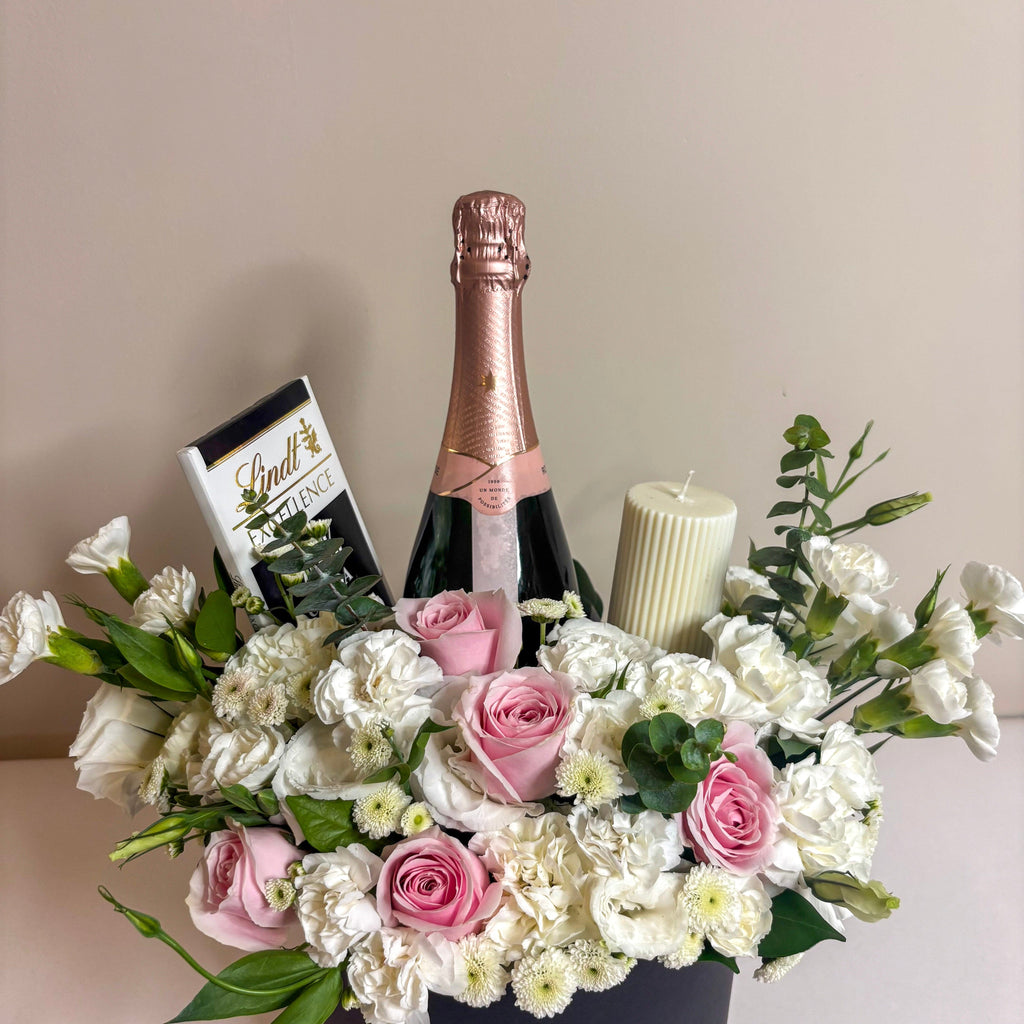 • A rosy escape, sparkling delights, rich chocolate, and a warm candle, all artfully combined to create a gift that feels utterly indulgent. Don't forget our charming main character, the flowers :)