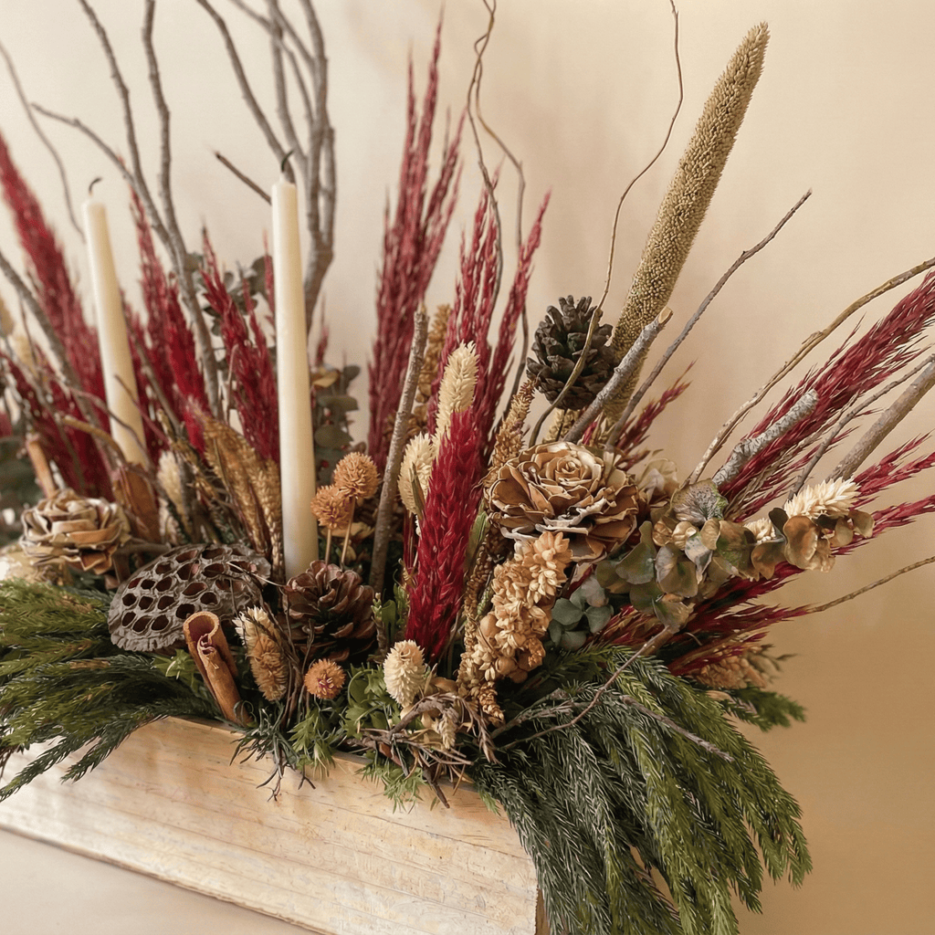 • An asymmetrical & rustic looking dry floral centerpiece for those who like to take a more raw approach to their aesthetic.