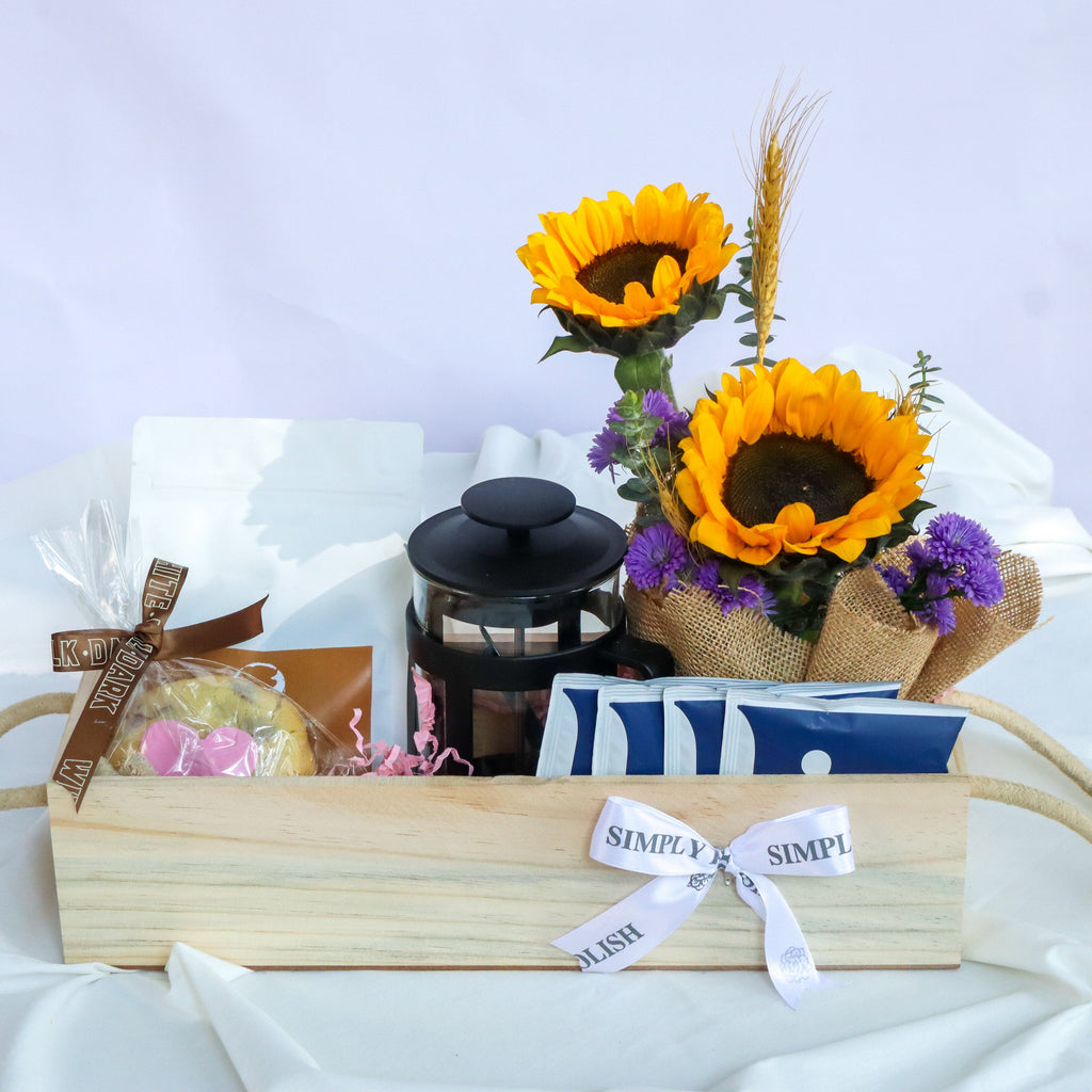 All of this comes in a reusable wooden tray with fresh sunflowers for a burst of bright sunshine.